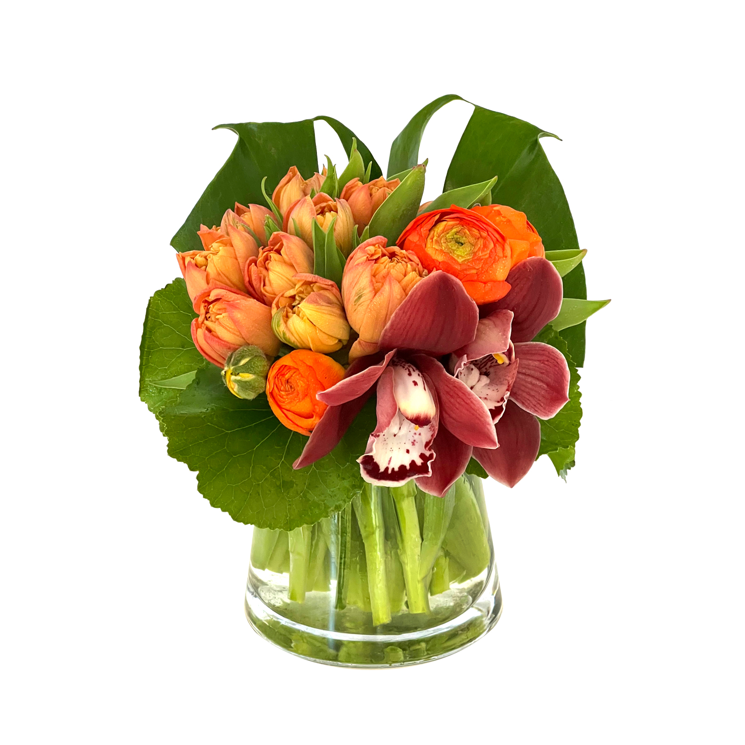 A little burst of fall tulips, orchids and ranunculus in a 4” clear glass vase.