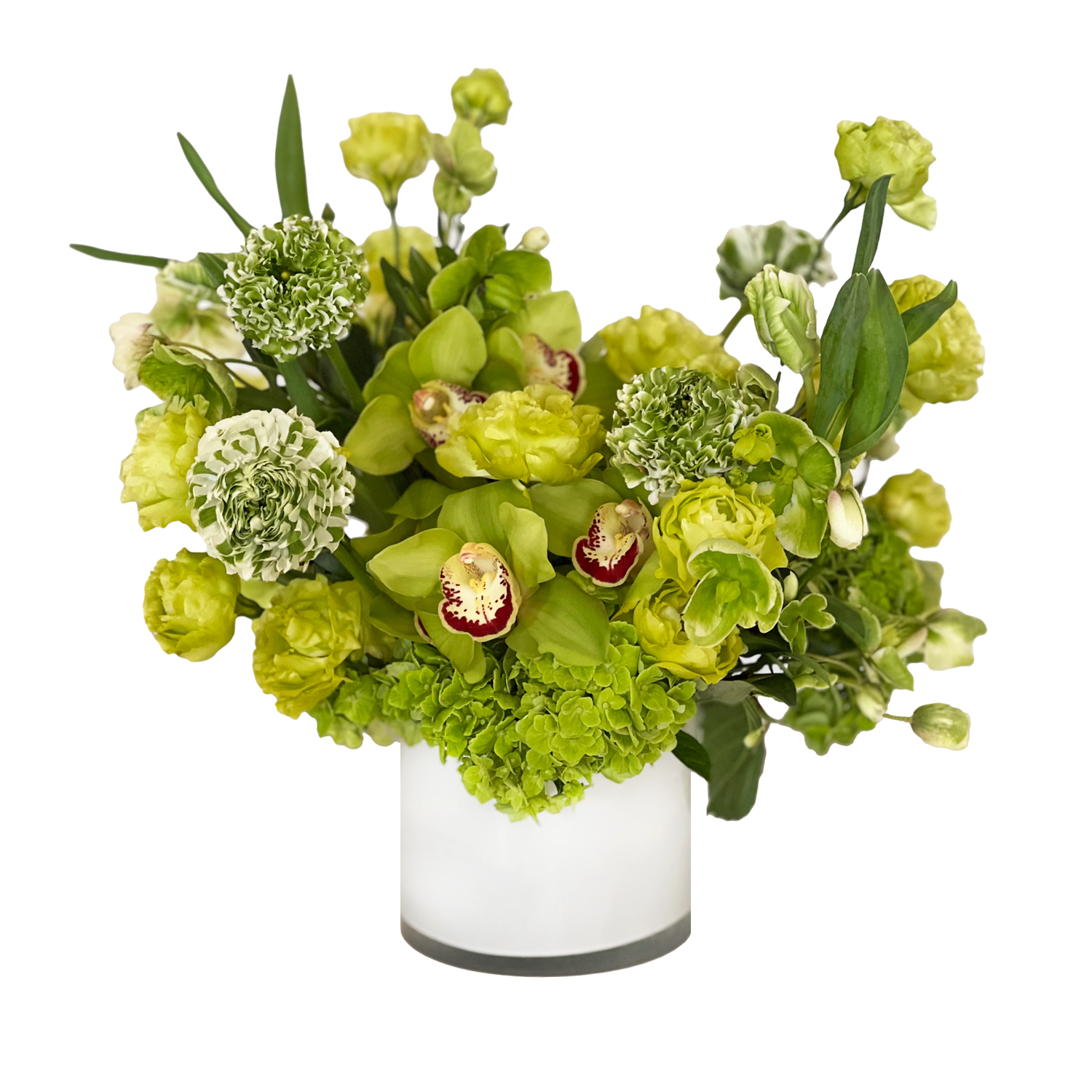 A crisp modern blend of green blooms in a 5” white glass vase.